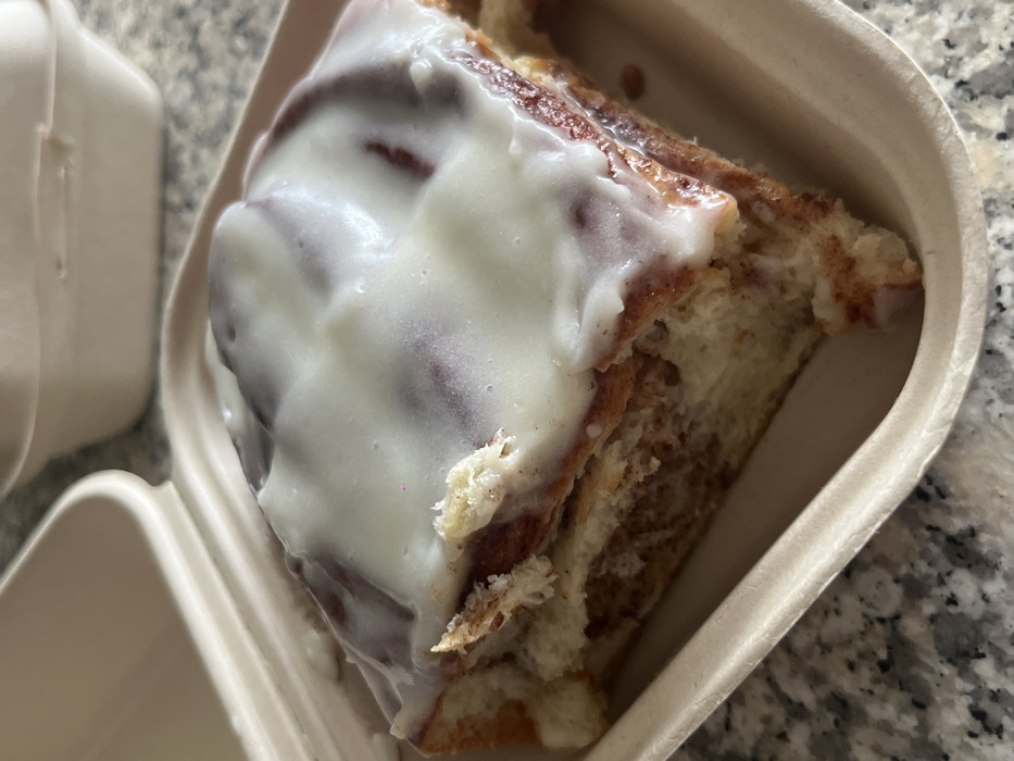 - "A cinnamon roll with white frosting sits in a light-colored, disposable container" by FM-3PMzr1, licensed under CC BY 4.0