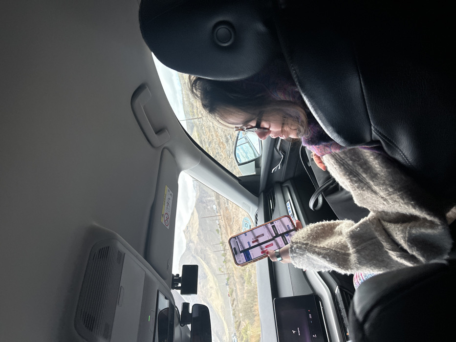 woman sitting in the passenger seat of a car. She is looking at her phone which is held in her right hand. The woman is wearing a white sweater and a purple scarf. The car is driving on a road with mountains in the background. The image was taken in Arona, Spain at coordinates 28.068, -16.713. The car's interior is dark, with black leather seats and a gray headliner. The car's dashboard is visible in the background, showing a black display screen. There is a black bag on the seat next to the woman. The image was taken from the back seat of the car.