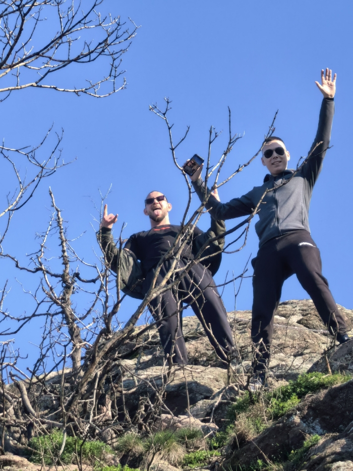 Two adult males are depicted from a low-angle perspective, standing on a rocky incline beneath a clear blue sky in the city of Ustina, Bulgaria. The foreground and mid-ground are characterized by numerous bare, dark, leafless branches and sparse green vegetation growing from the rocky terrain. The man on the left has a short beard, wears sunglasses, a dark t-shirt, an open olive-green jacket, and dark pants. He is positioned with his left arm raised, displaying a "rock on" hand gesture, and his tongue extended. His right hand holds a dark-colored smartphone, directed towards the viewer. The man on the right, also wearing sunglasses, a dark gray zippered hoodie, and dark pants with a white logo on the left thigh, stands with his right arm fully extended upwards, palm open, in a waving gesture. His left arm is bent. Both men appear to be posing for a photograph. The overall scene suggests an outdoor, possibly elevated, location with ample sunlight.