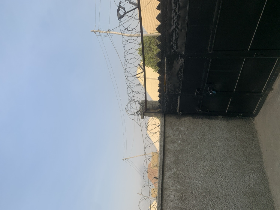 A section of a building, including a concrete textured wall topped with razor wire. A black metal gate with a padlock is attached to the wall. An electrical pole with wires and more razor wire is visible against a blue sky. Part of a roof structure is also visible above the gate.