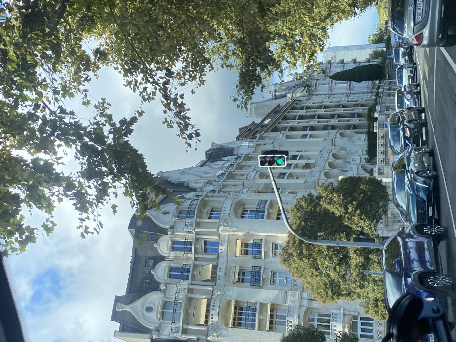 The image depicts a daytime urban street scene in Geneva, Switzerland, specifically along Quai Gustave Ador, with the prominent ornate building at 23 Quai Gustave Ador visible on the left. The perspective is from inside a vehicle in a multi-lane traffic queue. The environment includes a street lined with mature deciduous trees, whose green foliage partially frames the upper portion of the image against a partially cloudy sky. On the left side of the street, a grand, multi-story building, characteristic of Belle Époque architecture, features a light-colored stone or stucco facade, a dark mansard roof with multiple dormer windows, and numerous balconies with black wrought-iron railings. Several windows on the lower floors have yellow retractable awnings extended. Adjacent buildings further down the street exhibit similar architectural styles. A black traffic light with a single green illuminated signal for vehicular traffic is suspended from an overhead arm, positioned to the right of the ornate building. Below the traffic light, a queue of passenger vehicles occupies the lanes. Visible vehicles include a dark blue SUV (possibly a Toyota Yaris Cross) in the foreground to the left, a dark teal Peugeot 308 sedan immediately ahead of it, a dark SUV (possibly a Nissan Qashqai), a white Mini Cooper, and a silver Mercedes-Benz S-Class with a Swiss license plate "GE 875796" in the far right lane. Another Swiss license plate with "GE - 4280" is partially visible on the dark teal Peugeot. No pedestrians are visible. The vehicles appear to be stopped or moving slowly in a traffic congestion, permitted by the green light.