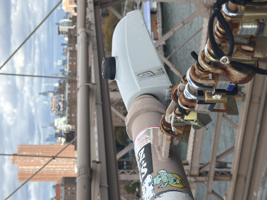 The image depicts a detailed view from the Brooklyn Bridge in New York City, United States, looking towards the Manhattan skyline under an overcast sky. In the immediate foreground, a weathered, beige-painted cylindrical pipe or structural beam runs horizontally across the frame, adorned with multiple stickers, including a green cartoon character with "Club" text and an American flag motif. Attached to this pipe is a light gray, ovular light fixture with a black cap. Directly below the pipe, a horizontal bar or cable is festooned with approximately two dozen "love locks"—padlocks of various sizes, colors (brass, silver, black, blue), and conditions, ranging from heavily rusted to relatively new. A black cord is also intertwined with these locks. The midground features the bridge's characteristic tan-colored steel suspension cables and crossbeams. In the background, the East River is visible, leading to the distinct Manhattan skyline. A prominent reddish-orange high-rise building is discernible on the left side of the distant cityscape, with numerous other skyscrapers appearing under the cloudy sky. No individuals are visible in the scene.
