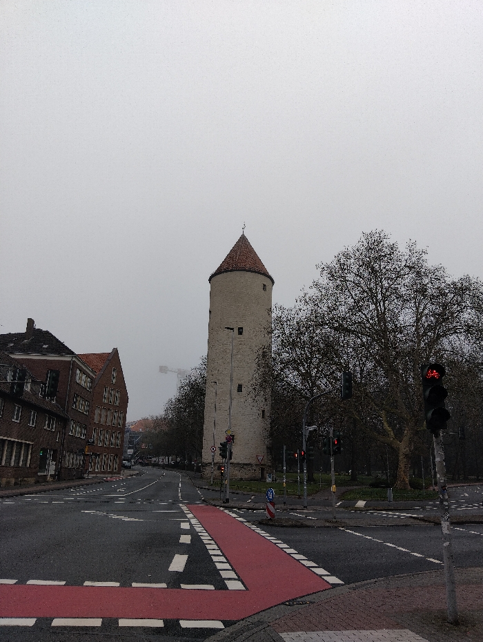 This image depicts an urban street scene in Münster, Germany, specifically at the intersection where the **Buddenturm** is located, near the Promenade and Buddenstraße. The scene is set on an overcast, light gray day, potentially misty, which obscures distant details and provides diffuse lighting. The dominant subject is the **Buddenturm**, a cylindrical stone tower with a reddish-brown conical tiled roof and a weather vane atop its spire, situated to the right of the image's center. The tower exhibits multiple small, rectangular window openings. In the foreground, an asphalt road with various white traffic markings is visible. A prominent **red-painted bicycle lane** with white dashed boundary lines crosses the foreground from left to right, indicating a dedicated path for cyclists. Multiple black-cased traffic lights are positioned throughout the intersection; the signal in the immediate foreground on the right displays a **red light**. To the left of the road, a row of multi-story brick buildings with gabled roofs and numerous windows line the street, consistent with residential or commercial architecture. Beyond these buildings and in the far background, a large construction crane is faintly discernible through the atmospheric haze. To the right of the Buddenturm, a park-like area with numerous **deciduous trees**, largely bare of leaves, extends, forming part of the Promenade. No individuals, pedestrians, or active vehicles are present within the frame, leaving the scene devoid of immediate human activity.