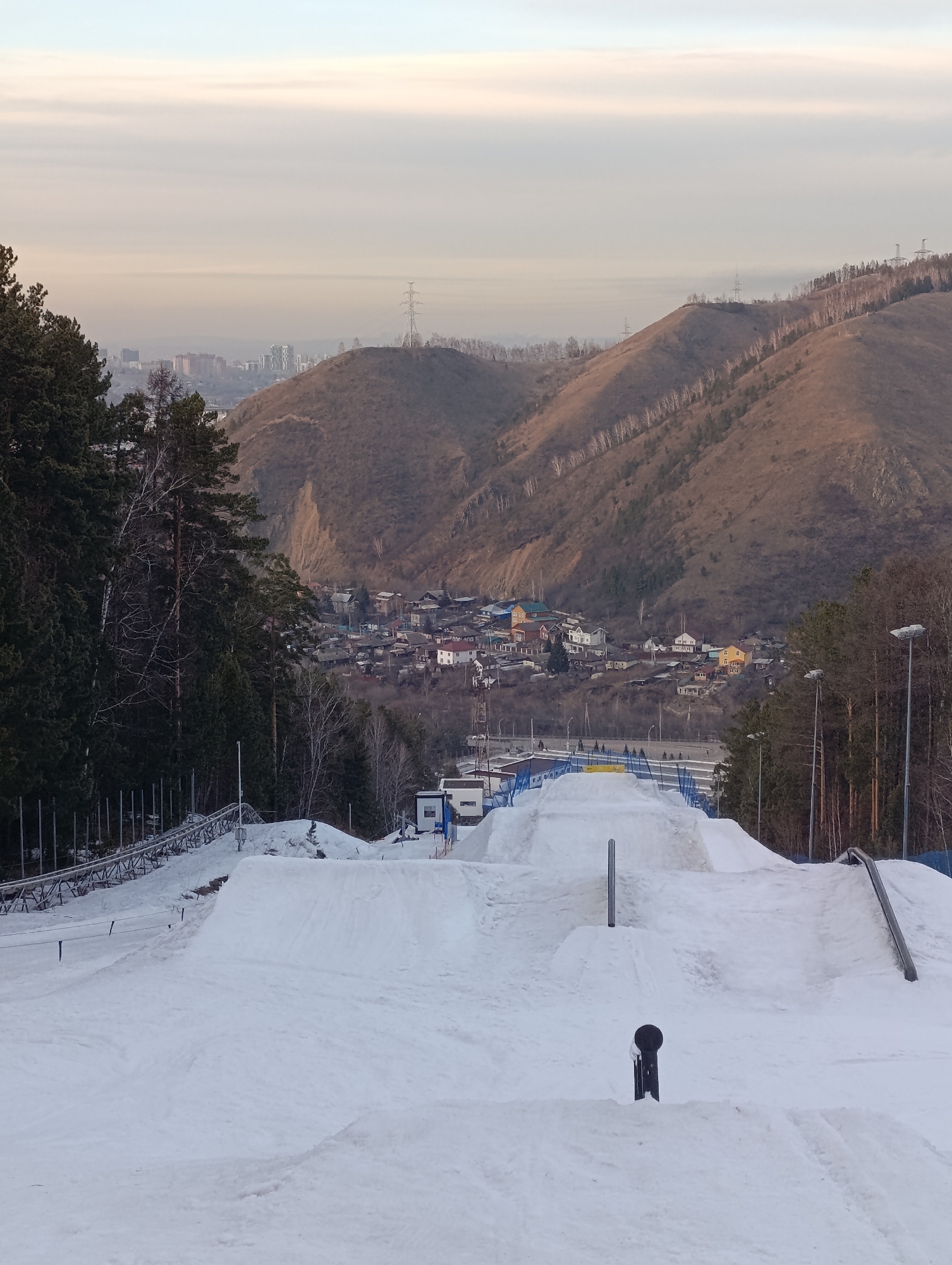 ski park in Krasnoyarsk, Russia. The foreground features a snow-covered ski run with jumps and rails. In the midground, there's a view of a residential area with houses and buildings nestled in the valley. The background displays rolling hills and mountains, with power lines visible on the ridges. The sky is overcast with a hazy appearance. Tall pine trees line the sides of the ski run. The overall scene depicts a winter landscape with a mix of urban and natural elements.