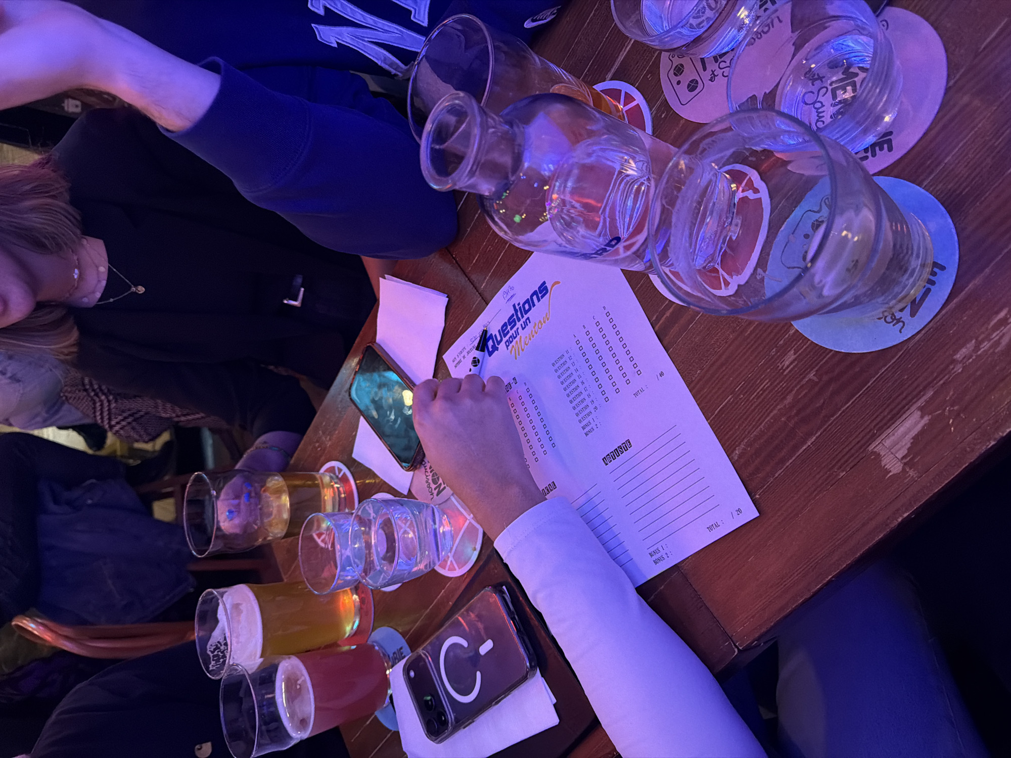 This image depicts a group of individuals seated around a wooden table in a dimly lit pub or restaurant, participating in a quiz night. The scene is illuminated by ambient blue and purple lighting. In the foreground, a person's right arm and hand, wearing a white long-sleeved shirt, are visible, holding a black pen over a white quiz sheet. The sheet is titled "Questions pour un Menton" and features numbered questions with blank lines for answers. To the left of this person's hand, a black smartphone with a clear MagSafe-compatible case rests on a white napkin. On the table, an array of beverages is present. These include glasses containing a reddish-pink drink, an amber-colored beer with foam, and a lighter yellow liquid. Several clear glasses filled with water are also visible, along with a clear glass bottle of water. Various colorful coasters, some bearing fragments of text such as "Bin" (likely part of "Bin Cliche") are placed under the drinks. Another smartphone with an illuminated green-tinted screen lies near the center of the table. In the mid-ground, the lower face and torso of a person with shoulder-length brown hair are visible, wearing a dark top and multiple delicate necklaces. To their right, the arm and shoulder of another individual wearing a navy blue sweatshirt with a white "N" or similar letter are seen. Blurred figures and parts of chairs are visible in the background, suggesting a crowded environment. Based on the "Questions pour un Menton" quiz sheet and the "Bin Cliche" coaster branding, this scene is taking place at a pub quiz hosted by Bin Cliche, which commonly occurs at a **Le Randolph Pub Ludique location in Montreal, Canada**. The individuals are actively engaged in the quiz, writing answers and consuming beverages.