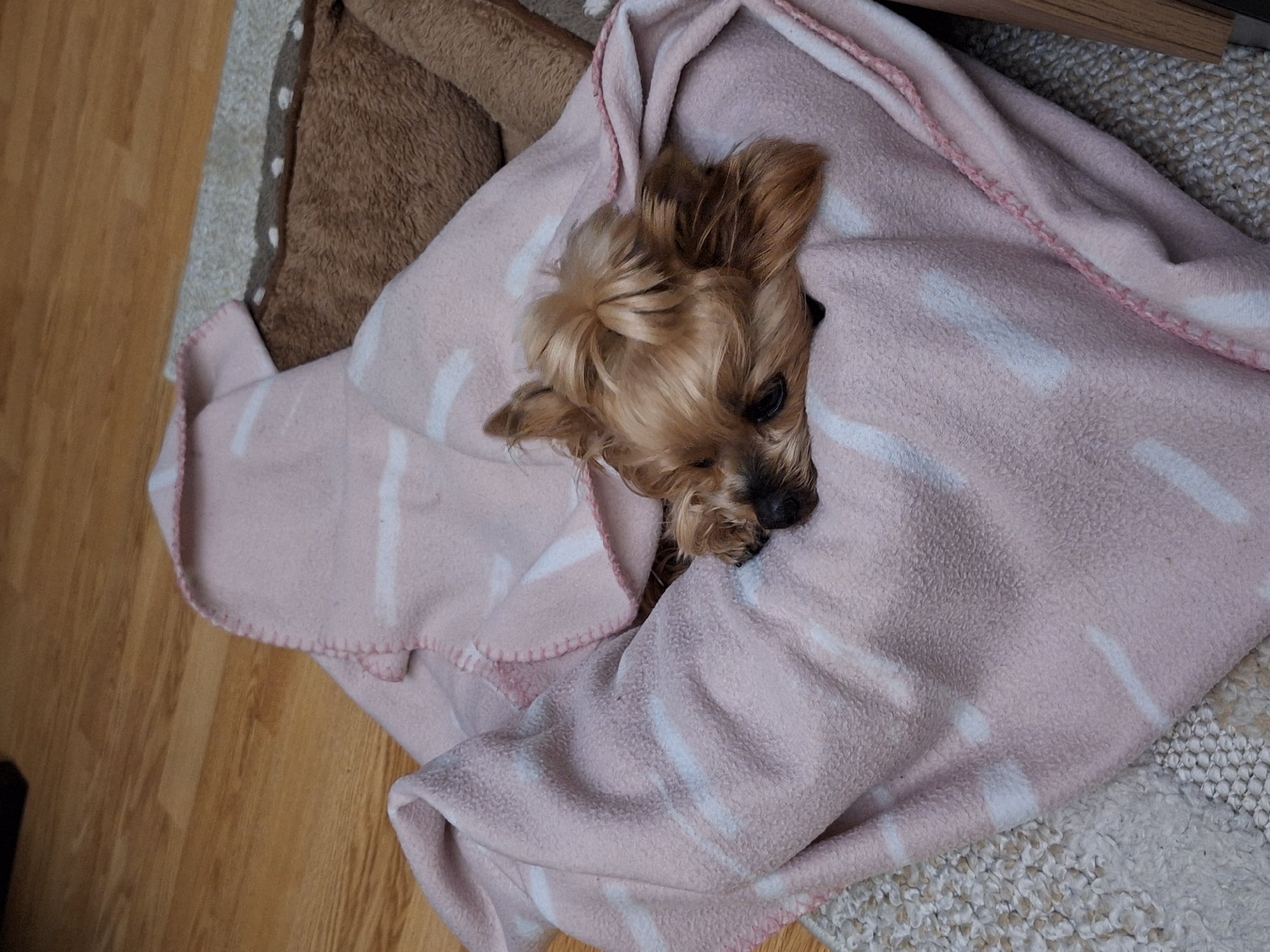 - "A small, brown Yorkshire Terrier dog is mostly covered by a light pink and white striped fleece blanket" by FM-Ac1q33, licensed under CC BY 4.0