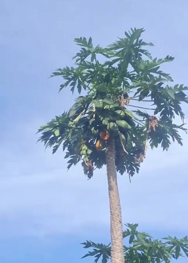 tall papaya tree with green leaves and ripe papayas hanging from its trunk