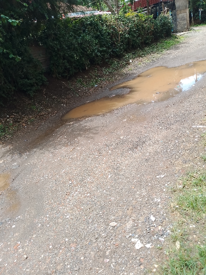 This image depicts an unpaved road in Olkeri ward, Kenya, characterized by a gravel and dirt surface. A prominent feature is a large, irregularly shaped puddle of muddy, brown water located centrally on the road, with smaller puddles also present. Reflections of the sky are faintly visible on the water's surface in the larger puddle. To the immediate left of the road, a dense, overgrown hedge or line of bushes with dark green foliage extends along an elevated bank. Behind this vegetation, a building with a reddish-brown roof is partially visible. Further in the background, towards the upper right, a grey concrete or stone pillar stands, possibly part of a gate or fence, with additional reddish-brown structures visible beyond it. The right edge of the frame shows a strip of green grass bordering the road. No individuals, animals, or active events are discernible within the scene.