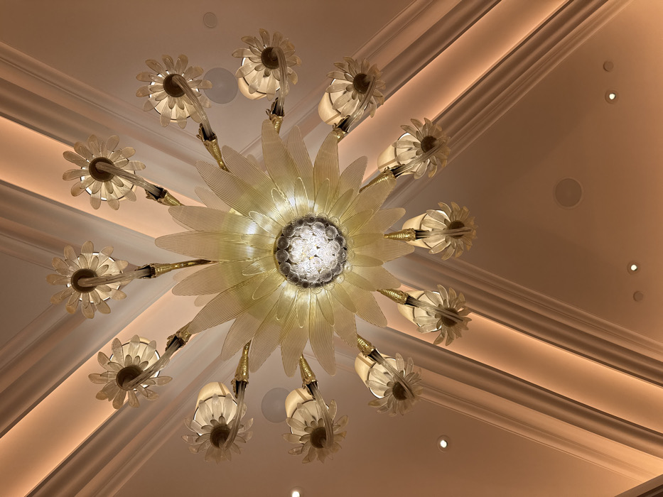 The image displays an ornate, illuminated chandelier affixed to a ceiling, located in Unknown, Macao