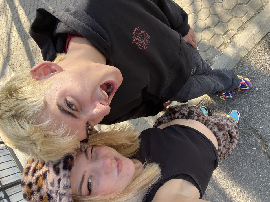 The image captures two young adults in a high-angle, selfie-style photograph outdoors in Sofia, Bulgaria, under direct sunlight. On the left, a female-presenting individual with blonde hair wears a leopard print faux-fur bucket hat and a black sleeveless crop top, exposing her midriff. She winks with her right eye and has a slight smirk, looking directly into the camera. She wears leopard print trousers or a skirt and light blue and white sneakers with black accents. On the right, a male-presenting individual with platinum blonde hair, a septum piercing, and a dark complexion, wears a black hooded sweatshirt with a red anatomical heart graphic containing "TECHNO" text on the left chest. He has an open-mouthed expression, appearing to grimace or yell, and looks directly at the camera. He wears dark wash jeans and multi-colored sneakers featuring prominent purple, yellow, red, and blue patterns. The individuals are standing on a paved surface composed of dark grey asphalt to the left and hexagonal light-colored pavers to the right, separated by a concrete curb. A blurred background reveals a light-colored building with vertical architectural features and railings in the upper left quadrant.