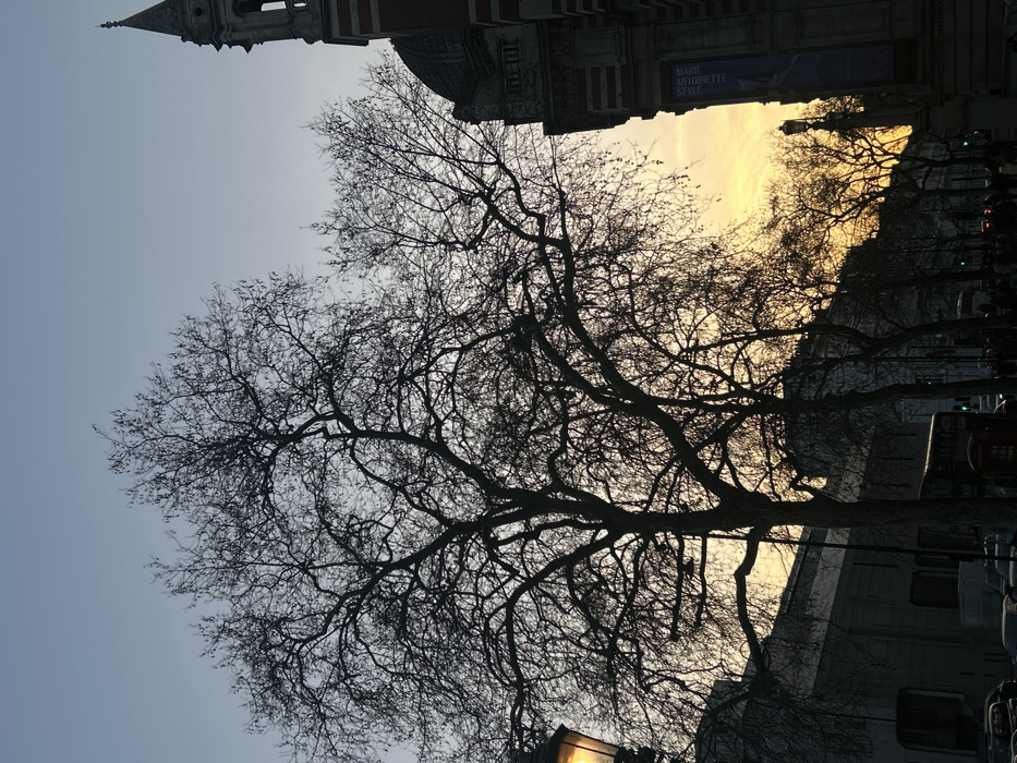 A bare tree dominates the scene, its intricate branches silhouetted against a pale sky. Behind the tree, a building with a dome and tower-like structure emerges, possibly a historical landmark. Hints of yellow suggest either sunrise or sunset. In the background, the blurred shapes of more trees and buildings indicate a busy urban landscape, possibly a street with traffic lights visible. The scene appears to capture a moment of urban tranquility in winter.