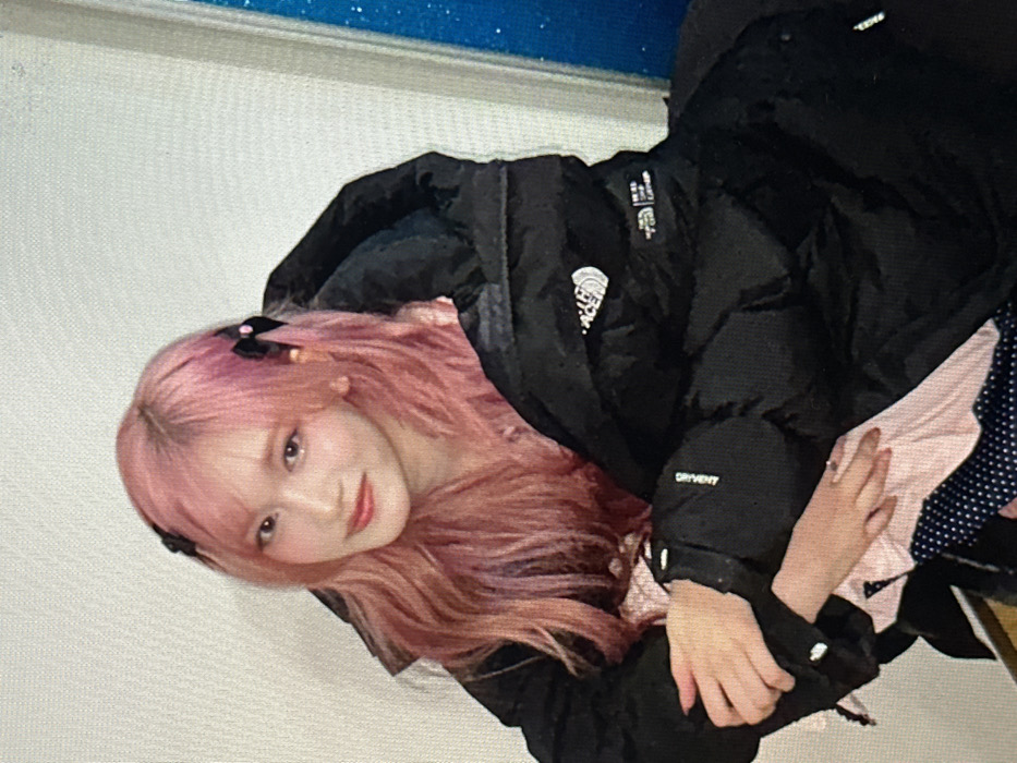 A female individual with long, wavy, pink-dyed hair and bangs is depicted from the waist up, seated indoors