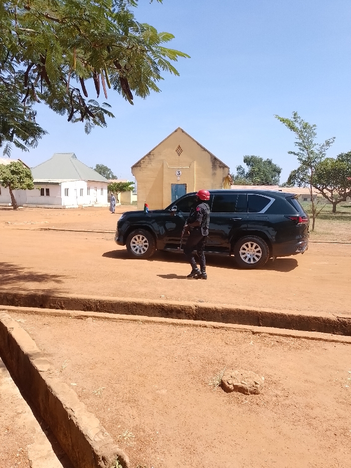 The image depicts an unpaved, reddish-brown dirt area in Kaduna, Nigeria, under a clear blue sky. A dark-colored SUV, possibly a Lexus LX, is parked centrally, facing partially left. A person in a black tactical uniform, red helmet, and black boots stands next to the front passenger side of the SUV, holding a long-barreled firearm pointed downwards. Two small flags are mounted on the SUV's front fenders. In the background, a single-story yellow-painted building with a gabled roof and a blue door is visible; a white circular sign with the number "3" is affixed above its entrance. To the left of the yellow building, two white-painted buildings with light green gabled roofs are present, with a distant figure in light clothing walking between them. A tree branch with green leaves and dark, elongated pods extends into the upper left quadrant of the frame. The immediate foreground shows two parallel, low, raised earthen or concrete structures with a small rock between them on the dirt ground.