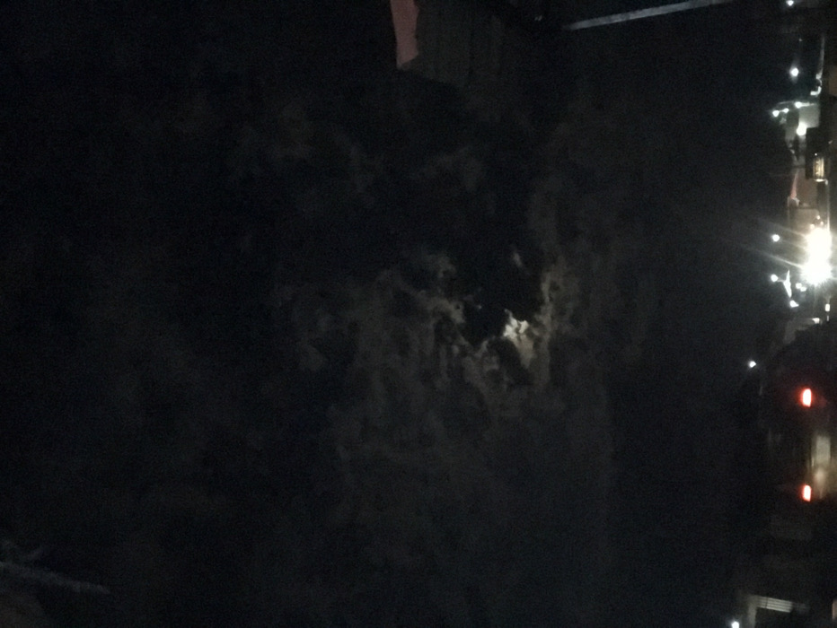 This image depicts a nighttime scene in Narayi, Nigeria. The upper two-thirds of the frame show a dark sky dominated by extensive, irregular cloud cover. A portion of the moon is visible through a central break in the clouds, casting a soft, diffuse light that illuminates the surrounding cloud edges. The lower third of the image presents a ground-level view of an environment containing artificial light sources. Two distinct red lights, consistent with vehicle taillights, are visible in the lower-left. Multiple bright white light sources, characteristic of vehicle headlights or streetlights, are present in the lower-right and center, producing prominent lens flares. Faint, dark silhouettes, possibly structures or vegetation, are discernible along the very bottom edge of the frame against the ambient light. No discernible human figures are present. The scene indicates an active roadway or street at night.