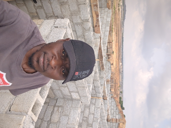 An adult male with a dark complexion and a short beard is depicted in a selfie, looking directly at the camera with a neutral expression. He wears a black baseball cap with white and red lettering, and a grey t-shirt with a partially visible red and white shield-shaped logo bearing the text "PROS." The scene is set at a construction site in Karsana 2, Nigeria. Behind the man, the partial structure of a building is visible, consisting of walls constructed from grey concrete hollow blocks. Wooden planks are horizontally laid across the tops of some of these walls, likely forming part of a lintel or beam support system. The background features an expansive, undeveloped landscape with sparse, dry vegetation, stretching towards a distant horizon line where low-lying hills and scattered structures are visible under an overcast sky with varying shades of grey clouds.