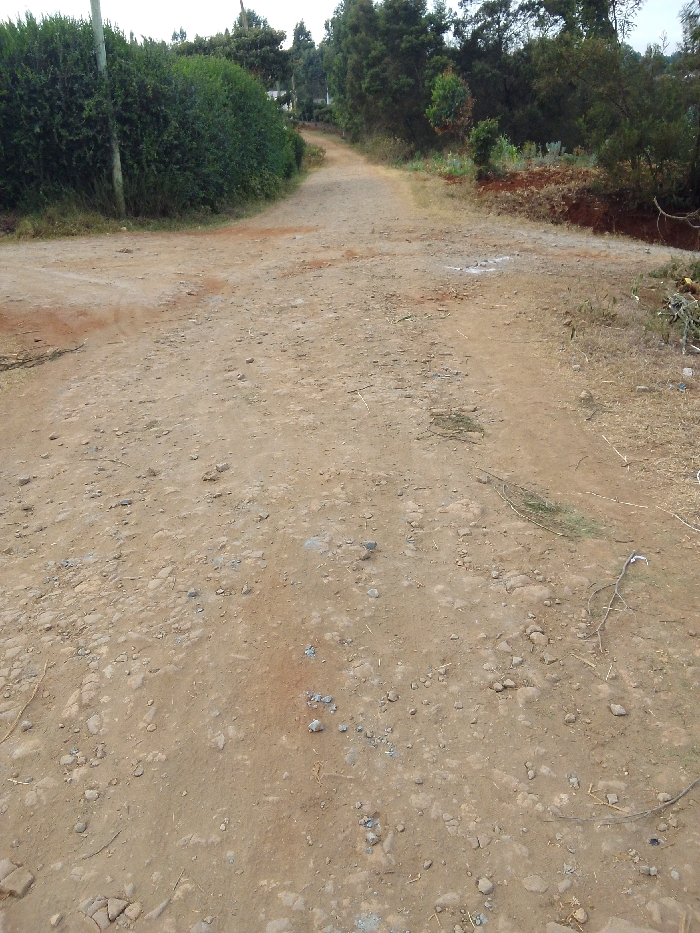 A dirt road, light brown and rocky, stretches into the distance, appearing to lead uphill