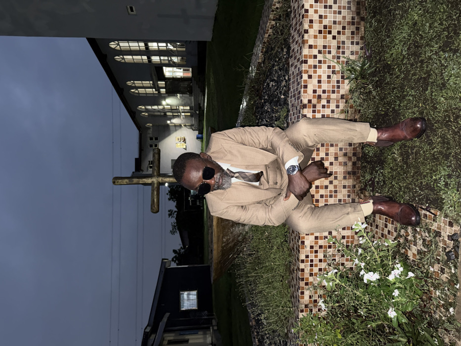 The image depicts an outdoor scene at dusk or night. A single adult male, appearing middle-aged or older with a graying beard and dark sunglasses, is seated on a low wall constructed of mosaic tiles in brown and beige tones. He wears a tan three-piece suit, a patterned brown tie, and dark brown leather Chelsea boots; a silver-toned watch is visible on his left wrist. Behind him, a large, weathered wooden cross stands upright in a grassy area. To the right of the cross is a large, light-colored building with multiple illuminated arched windows, resembling a church. To the left, a smaller, dark building with a single window is visible. The foreground includes sparse grass and green foliage with small white flowers. Overhead, power lines traverse a dark, cloudy sky. While the environment is consistent with religious grounds in an urban or suburban area, the specific city of Ado, Nigeria, is not visually verifiable within the image.