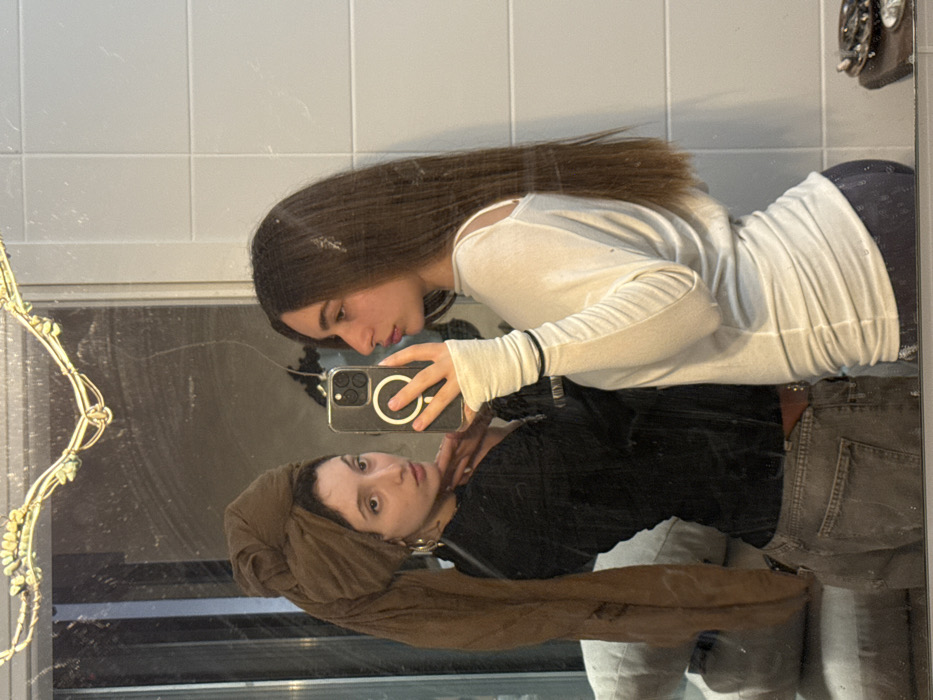 - "A woman with long brown hair in a white top holds a phone, reflected in a mirror" by FM-MKhmN2, licensed under CC BY 4.0