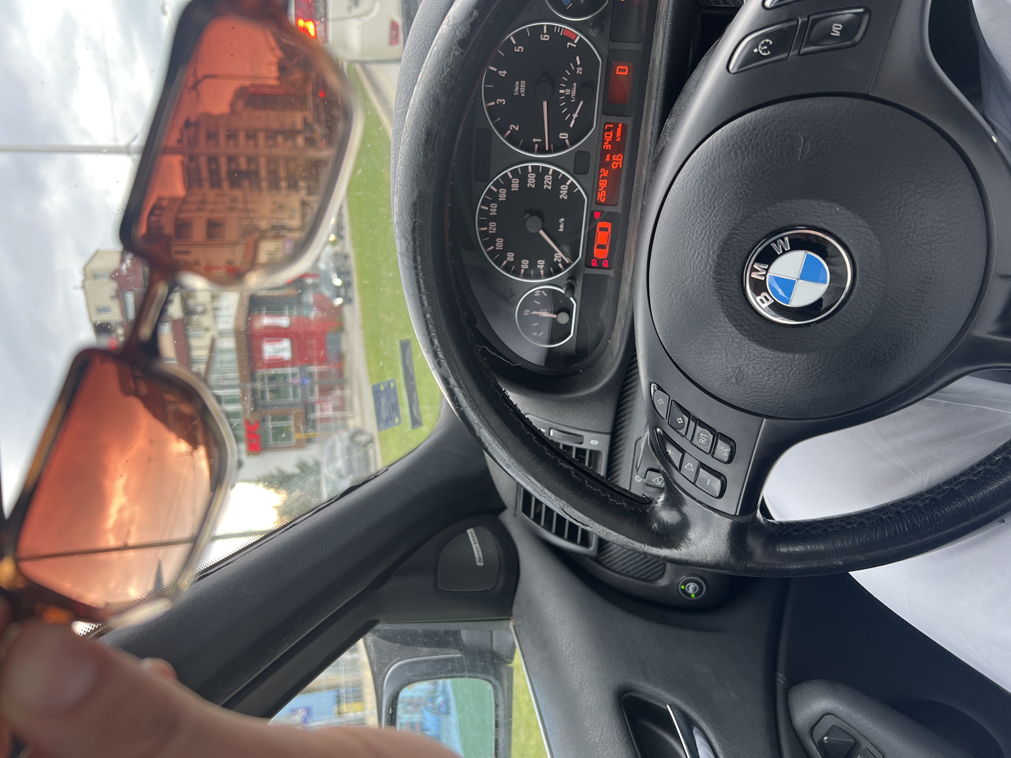 The image, taken from inside a car, features a partially obscured view through a pair of sunglasses held in someone's hand. The reflection on the sunglasses shows an out-of-focus street scene. Through the car windshield, one can see a street with buildings and cars, suggesting an urban environment. The car's interior is visible, focusing on the dashboard and steering wheel with the BMW logo, confirming the car's brand. The speedometer reads 9.6 L/100km and shows a mileage of 264872. Based on the architecture reflected in the sunglasses and the street scene visible through the windshield, as well as the vehicle's registration information of the car, the location is likely in Sofia, Bulgaria.