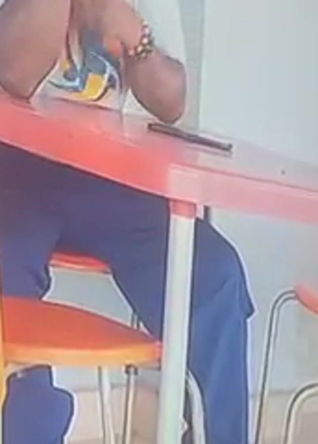 man sitting at a red table surrounded by orange chairs with butterfly cut-outs. He is wearing a white shirt with a design, dark blue pants, and a beaded bracelet. A cell phone sits on the table. The man is later shown talking on his cell phone, up close. Another person sits at another table in the background.