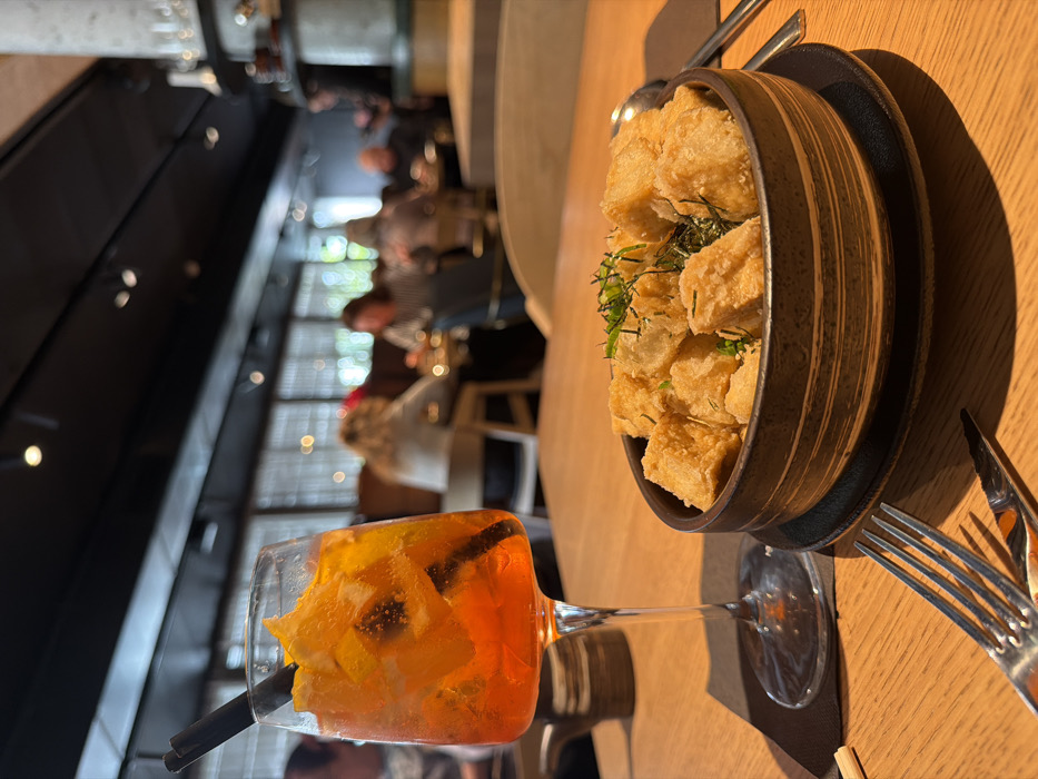 The scene depicts a dining table within a restaurant located in Kiryat Ono, Israel. In the foreground, a stemmed glass holds an orange-hued beverage with ice, numerous orange slices, and two black straws, resting on a black square coaster on a light-colored wooden table. Adjacent to it, a dark brown, ribbed ceramic bowl, seated on a circular dark plate, contains multiple golden-brown, fried rectangular food items, garnished with finely chopped green herbs and thin strips of dark seaweed. A silver spoon is present in the bowl, and a pair of wooden chopsticks is partially visible to the right of the bowl. A silver fork and knife are positioned on the table surface in the bottom left corner. The background, largely blurred, shows the interior of a contemporary restaurant with a dark ceiling, recessed lighting, and large windows featuring horizontal blinds or grates. Several indistinct figures of individuals are seated at tables throughout the restaurant, engaged in dining or social interaction. A decorative, multi-tiered structural element is partially visible on the right side of the frame.