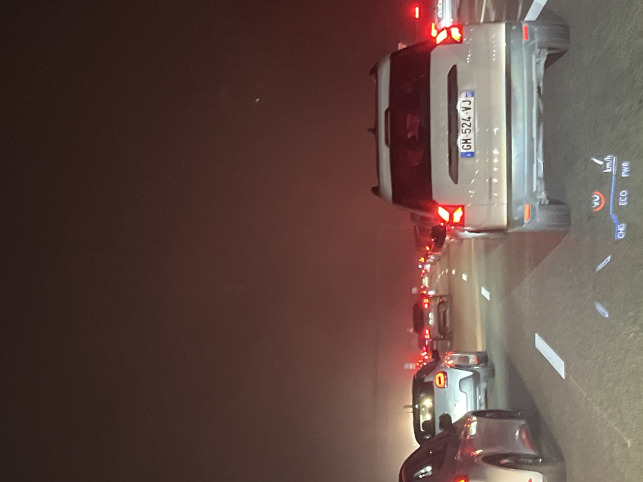 The image depicts a multi-lane highway at night, consistent with a location within or near Ostwald, France, indicated by the French license plate "GH-524-VJ". The scene shows heavy traffic or a traffic jam with multiple vehicles stopped or moving slowly. In the immediate foreground, from the perspective of the camera, a beige or gold Dacia SUV (license plate "GH-524-VJ") occupies the right-center lane. Its red taillights are illuminated. To the left of the Dacia SUV, a silver or light-colored car is partially visible in the adjacent lane, also with illuminated taillights. Further down the road, numerous vehicles extend into the distance, characterized by a dense array of red taillights, suggesting significant congestion. White dashed lane markings are visible on the asphalt. A digital dashboard display is partially visible at the bottom of the image, indicating vehicle status or mode with "CHG", "ECO", and "PWR" indicators, alongside "90" and "km/h", suggesting a speed limit or current speed context. The sky above is dark, with a reddish ambient glow permeating the atmosphere, likely originating from the extensive vehicle lighting. No individual persons are distinctly visible outside of vehicles.