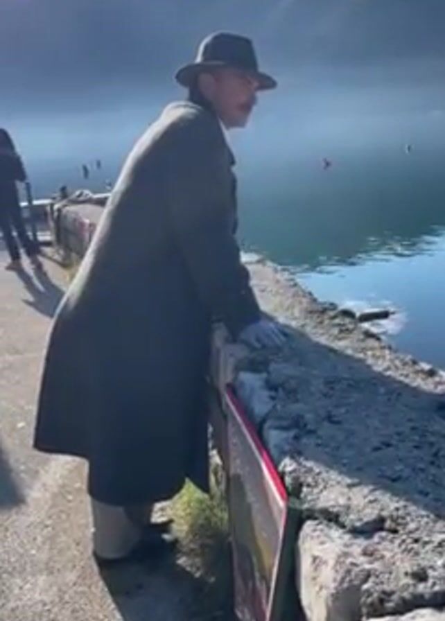 man standing by a stone wall, looking out over a lake. The man is dressed in a long coat, a hat, and white gloves, giving him an old-fashioned appearance. The lake is surrounded by mountains and the sky is blue with a few clouds. There are other people visible in the background, and a sign attached to the wall. The lighting suggests it is a sunny day. The man appears contemplative, gazing out at the scenery.