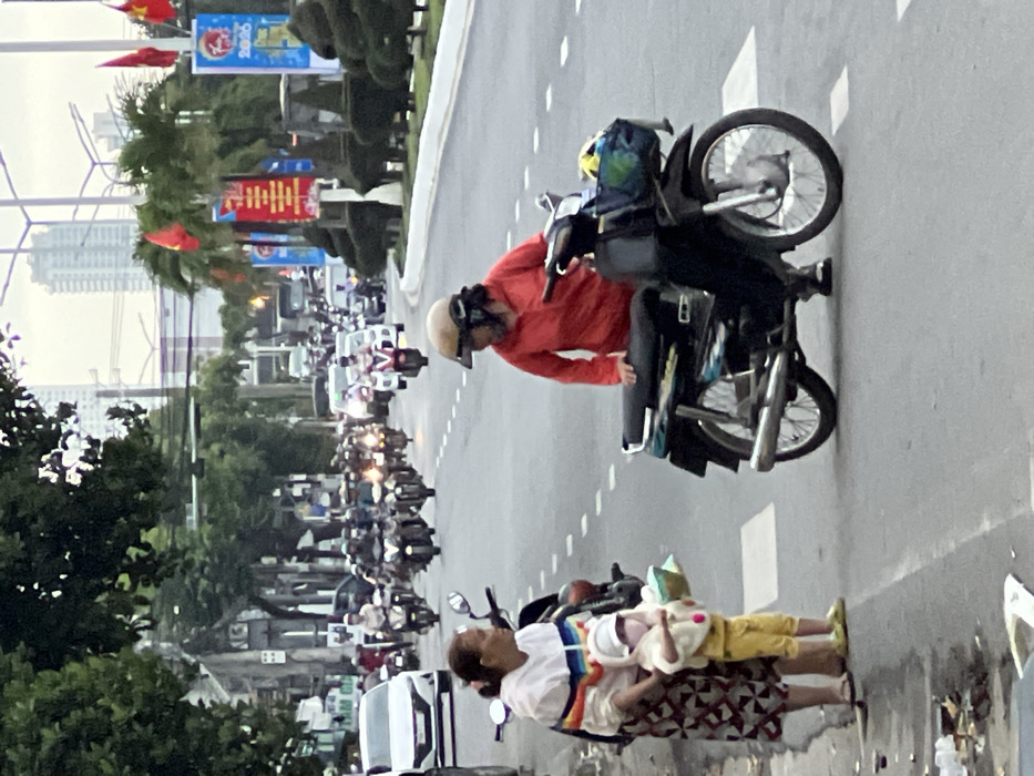 The image displays a street scene in Diên Khánh, Vietnam, under overcast or subdued lighting. In the foreground, on the left, an adult female wearing a white and rainbow-striped hooded top and a patterned skirt stands beside a parked motorcycle, holding a light green container in her left hand. Next to her is a young child, dressed in a yellow outfit, a white hooded top with yellow pom-poms, a white face mask, and light green shoes, holding a small white object. On the right, an adult female wearing a red long-sleeved shirt and a beige helmet with a raised visor stands next to a dark-colored motorcycle, her left hand resting on its rear rack. A blue and green bag is placed in the motorcycle's front basket. Both women appear oriented towards each other. The asphalt road features white dashed lane markings and rectangular white ground markings. A central median, adorned with manicured shrubs, small trees, utility poles, and multiple red flags with yellow stars (Flag of Vietnam) and banners (one visible with "2020"), separates the traffic lanes. In the midground, a continuous flow of traffic, predominantly motorcycles with helmeted riders, moves along the road, alongside a white car on the far left. Tall urban buildings are visible in the distant background.
