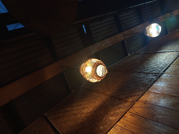 The image provides an upward-angled view of an interior ceiling and upper wall structure, located in Pantegajah, Indonesia. Two distinct hanging lamps illuminate the scene. A prominent, spherical lamp, crafted from intricately woven material (likely rattan or bamboo), hangs centrally from a dark wooden ceiling beam, emitting a bright, warm yellow light. Further to the lower right, a second, smaller, ovoid lamp, also of woven construction, hangs from another wooden beam, emitting a cooler, whiter light. The ceiling consists of dark corrugated metal sheeting, supported by dark wooden beams. The upper wall section is composed of woven bamboo or rattan panels displaying a diagonal basketweave pattern, while the lower visible wall segment is constructed from vertical wooden planks. A large, dark, circular object is partially visible in the upper right corner, suspended near the ceiling. No individuals or specific actions are depicted within the frame.