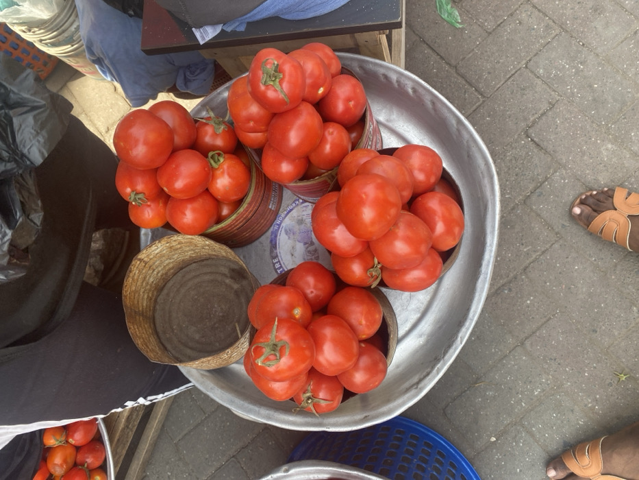 The image depicts an overhead view of a market stall in Accra, Ghana, showcasing a display of fresh red tomatoes