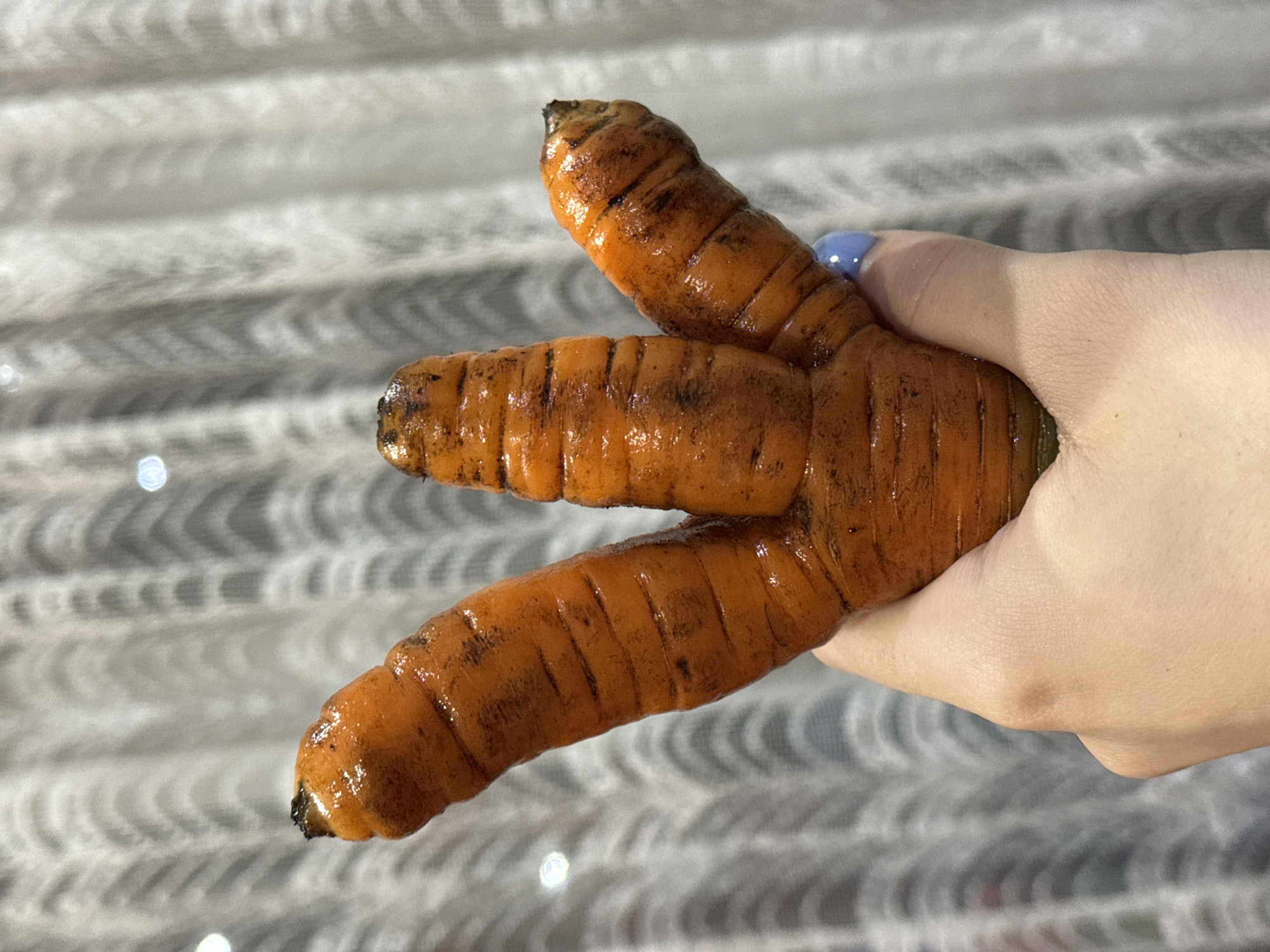 A hand holds a deformed, three-pronged carrot