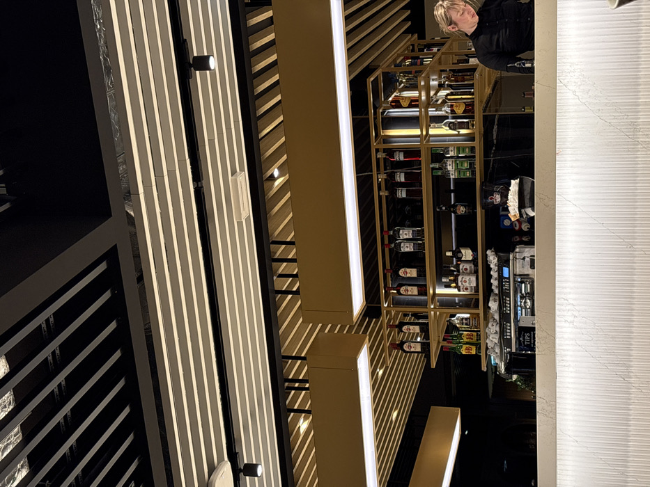 The image captures the interior of a contemporary bar or restaurant in Fiumicino, Italy. The scene centers on a white bar counter, featuring a vertically fluted front surface with subtle gray marbling. Behind the counter, a fair-skinned female individual with light-colored hair, wearing a dark, long-sleeved top, is visible on the right, her head angled downwards as if engaged in an activity below the frame. On the counter behind her, a professional espresso machine with stacked cups and a white container holding small packets are present. Above the counter, a golden, multi-tiered shelving unit displays an assortment of liquor bottles, including brands such as Campari, Jim Beam, and Baileys, arranged in rows. The ceiling features a modern architectural design, incorporating parallel dark and light striped panels, with additional diagonal wooden slats in a lighter tone. Overhead illumination is provided by several recessed track spotlights and two large, rectangular, gold-colored suspended light fixtures that emit bright, diffused light. The area is uniformly and brightly lit by artificial sources.