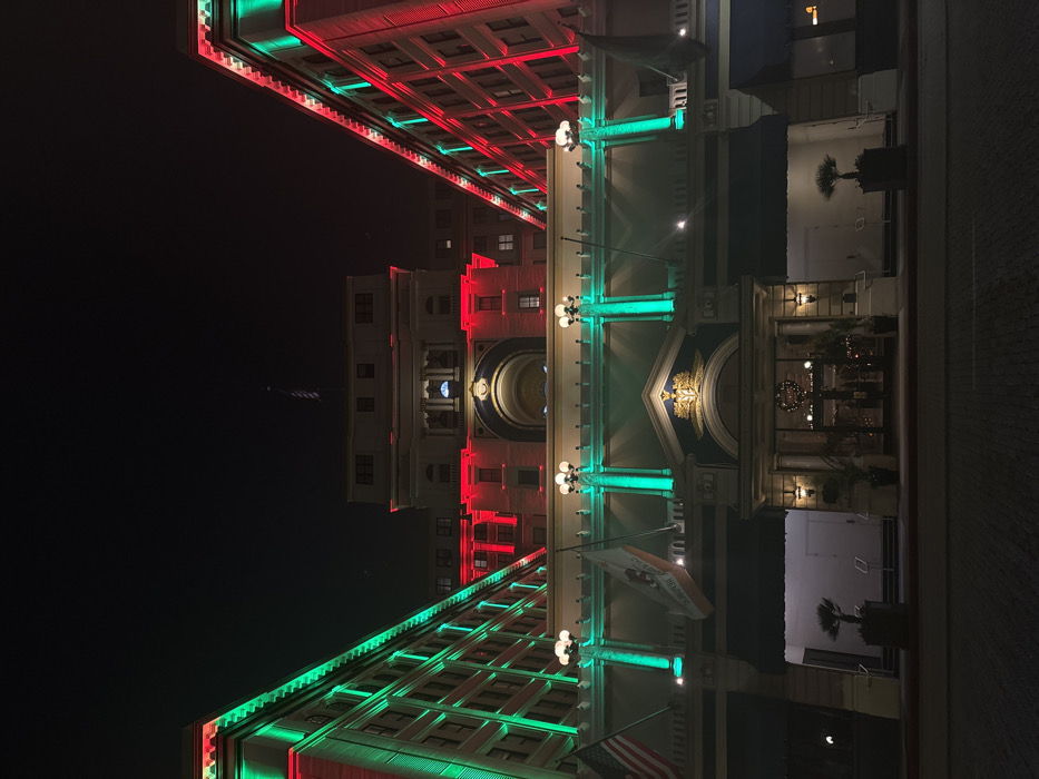 A tall building is illuminated with red and green lights. The structure is symmetrical with a central clock tower-like feature. There are two flags hanging from the building, one appearing to be an American flag. The lighting is vibrant and emphasizes the architectural details of the building at night.