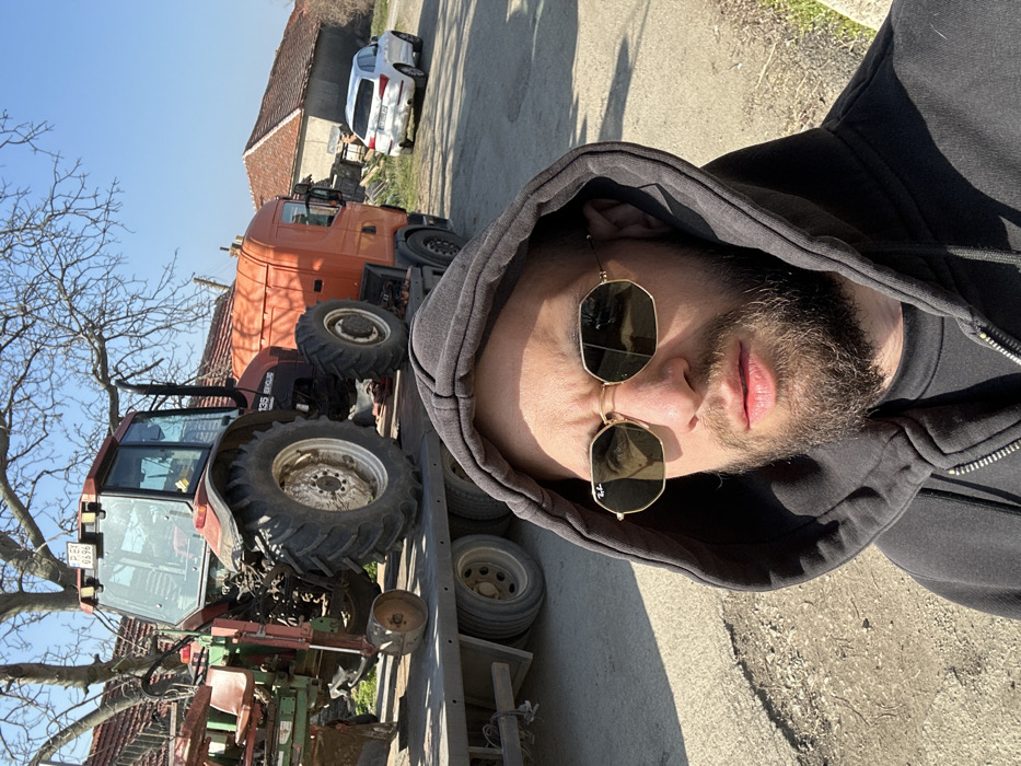 A male individual is depicted in a close-up selfie, occupying the lower half of the frame in Oriahovitsa, Bulgaria, under a clear blue sky. He has a beard and is wearing a black hooded zippered sweatshirt with the hood raised, along with gold-framed octagonal Ray-Ban sunglasses. His direct gaze is toward the camera. In the background, a red Case IH 135 MX tractor (license plate P E I 0696), equipped with agricultural machinery attached to its rear, is loaded onto the flatbed of an orange-cabbed semi-truck. A white Audi Q5 SUV is parked on the right side of a dirt or gravel road beyond the truck. Multiple residential structures with red tile roofs and a bare deciduous tree are visible, indicating a rural or village setting during daylight hours.