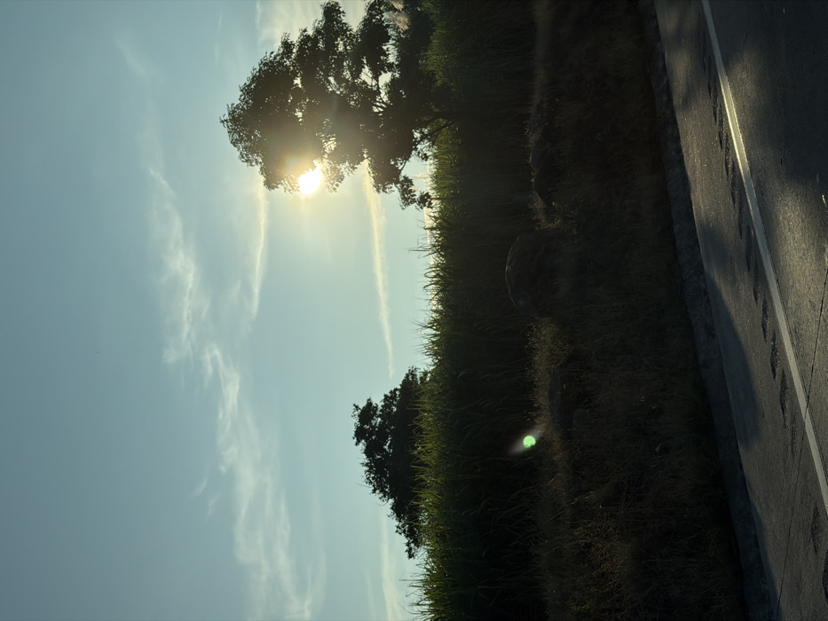 Sunlight bursts through the branches of a tree on a grassy embankment. A second, smaller tree is positioned below. Thin clouds streak across the blue sky. A paved road runs along the right edge of the frame, marked with a white stripe. The image is oriented sideways.