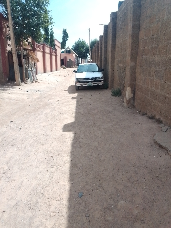 The image displays a bright, static outdoor scene on an unpaved dirt road located in a residential area of Katsina, Nigeria, near Muhammadu Dikko Stadium