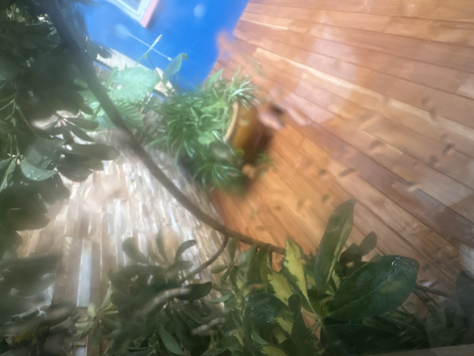 The image, captured in Barcelona, Spain, depicts an outdoor or semi-outdoor residential area from a slightly elevated perspective, rendered with significant blur and a hazy effect. The foreground and left side are occupied by dense green foliage, including leaves with visible water droplets and some variegated green and yellow leaves. A light brown wooden deck floor with visible planking extends from the midground to the lower right, exhibiting reflective wetness across its surface. In the midground, towards the right, a brown ceramic pot contains a cluster of vibrant green plants. The background features a wall composed of horizontally stacked, light-colored, irregularly shaped stone or tile, and a section of a bright blue wall with a white rectangular outline, possibly a window frame. No individuals, specific actions, or interactions are observable in the scene.
