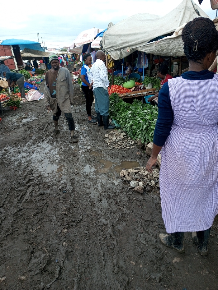 The image depicts an active outdoor market in Matungulu west ward, Kenya, under an overcast sky. The ground surface throughout the market is unpaved, extensively muddy, and characterized by numerous puddles and deep tracks. Multiple makeshift market stalls are visible, constructed with wooden frames and covered by various tarpaulins, primarily white and blue. In the immediate foreground, the back of an individual wearing a dark long-sleeved top, a light purple and white checkered apron-style dress, and black rubber boots is visible, positioned on the muddy ground. A small pile of light-colored rocks is situated on the mud to their right. In the mid-ground, a man wearing a green camouflage cap, a brown long-sleeved shirt, dark pants, and a light-colored jacket draped over his left shoulder stands facing the camera on the muddy path. To his right, three individuals are positioned near a market stall. This group includes a woman in a blue shirt and black pants, and a man in a white collared shirt, dark pants, and black rubber boots. This specific stall prominently displays large quantities of fresh red tomatoes piled on a wooden counter, with some contained in a green plastic bowl, and extensive bundles of green leafy vegetables arranged on the ground directly in front of the counter. A vendor, wearing a red apron, is visible behind this stall, apparently engaged in service. In the background, additional market stalls and numerous other individuals are visible, indicating ongoing commercial activity, with other produce like bananas also discernible.