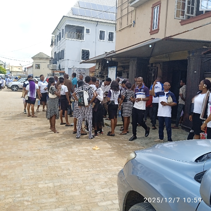 The image depicts a crowded street scene in Satellite Town, Nigeria, captured on 2025/12/7 at 10:59. Approximately 30-40 individuals, primarily adults, are congregated on an interlocking paved street. In the foreground, the front portion of a light gray SUV is visible on the right. The majority of people are gathered in the midground, with many wearing white tops, some with distinguishing logos or patterns, suggesting a group affiliation or event. A woman prominently positioned near the center wears a black and white vertical striped jumpsuit with a white backpack. Another woman on the far left has a purple head covering. Individuals are standing in various small groups, conversing, and observing their surroundings. One man in a blue and white polo shirt is visible walking towards the right, while another man in a white t-shirt and blue trousers stands with his right arm raised, gesturing. The background features two primary buildings. To the right, a two-story light brown building with an overhanging awning has a window with brown trim on the upper floor. Further back and to the left, a multi-story light gray building with black balconies and solar panels on its roof is visible. Several vehicles are parked or moving in the distant left background. Overhead power lines are discernible in the upper left. The street itself is paved with interlocking bricks, showing some wear and a small piece of yellow litter near the center. The lighting is diffused, indicating an overcast day or midday conditions.