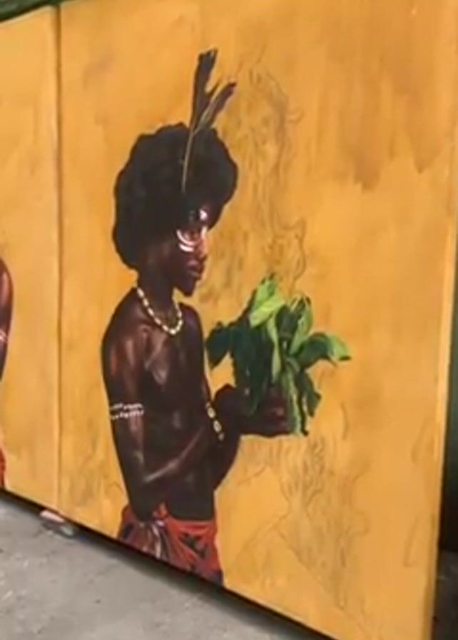 painting in progress, depicting a dark-skinned person with an afro adorned with feathers. The person wears white face paint, a necklace, and armbands, holding a cluster of green leaves and red berries. The artwork has a mustard yellow background with lighter yellow sketch lines of a figure behind the main subject. The painting is on a large canvas, which is positioned on the floor, leaning against a wall. There is another painting visible on the left of the frame, featuring a dark-skinned figure. The environment appears to be an art studio, based on the exposed concrete ceiling and location of the painting.