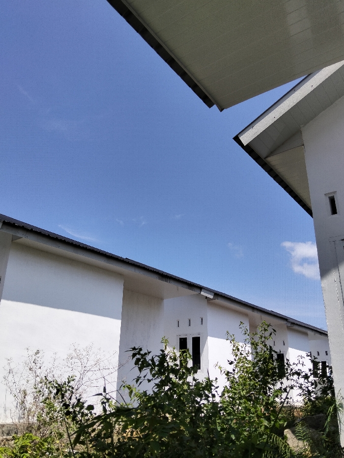 A bright sky fills most of the frame, peeking between roof overhangs of white buildings. One building is close, partially obscuring the sky to the right. The other buildings are a line of white, low structures with dark gray rooflines. Some windows are visible. Weeds and foliage fill the foreground, blocking the lower part of the buildings.