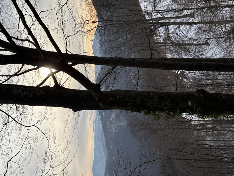 This image displays a winter mountain landscape, viewed through silhouetted deciduous trees, in the vicinity of Charkovo, Bulgaria