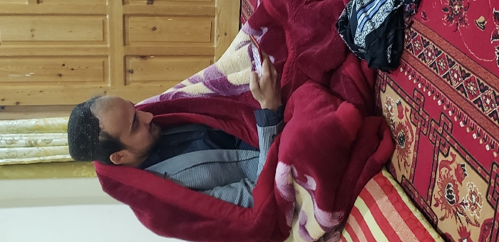 An adult male is seated on a red and beige patterned rug in an indoor residential setting in Kandahar, Afghanistan