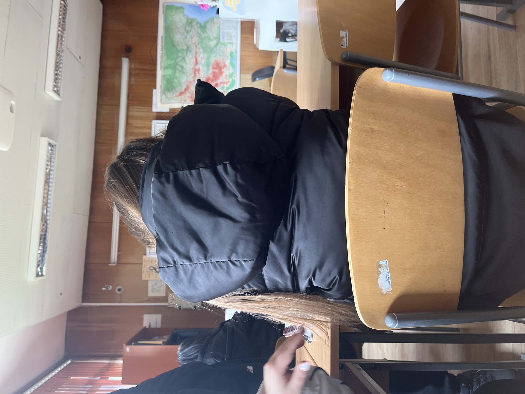 A person wearing a black puffer jacket is sitting at a wooden school desk in a classroom. The location is likely Kotel, Bulgaria. The person's hair is light brown and long. There are other desks and chairs visible in the classroom, along with a map on the wall and fluorescent lights on the ceiling. Another person is visible in the foreground.