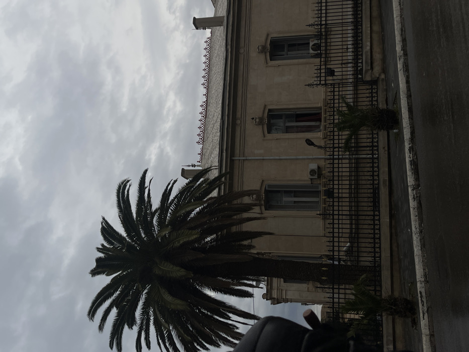 The image displays an urban street scene in Oran, Algeria, under a gray, overcast sky. A large, light-colored building with a sloped, dark-gray roof and red decorative cresting along its ridge occupies the background. Two chimneys are visible on the roofline. The building's facade features at least three windows with dark frames and partially open light-colored shutters; the middle window shows a glimpse of red fabric. Two external air conditioning units are mounted below the leftmost and rightmost visible windows. A black, wrought-iron fence with decorative finials separates the building from the sidewalk. A tall, mature palm tree with dark green fronds stands prominently on the left, partially obscuring the building's left side. Two smaller palm plants are positioned behind the fence along the sidewalk. A black streetlight with a curved arm is situated behind the fence, between the first and second windows from the left. The immediate foreground consists of a wet asphalt road, indicating recent precipitation, and a concrete sidewalk curb. A dark, blurred object is present in the extreme lower-left corner, suggesting a close-range perspective from a handheld device or vehicle. No human figures are discernible.