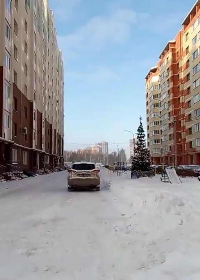 snowy courtyard in a residential area on a bright, sunny day. Tall apartment buildings border the courtyard on both sides. In the center, there's a small, decorated Christmas tree near a playground. A gold-colored SUV drives slowly along the snowy path. Later, two people, possibly a child and an adult, walk together in the snow. Piles of snow are visible, and other cars are parked along the sides.