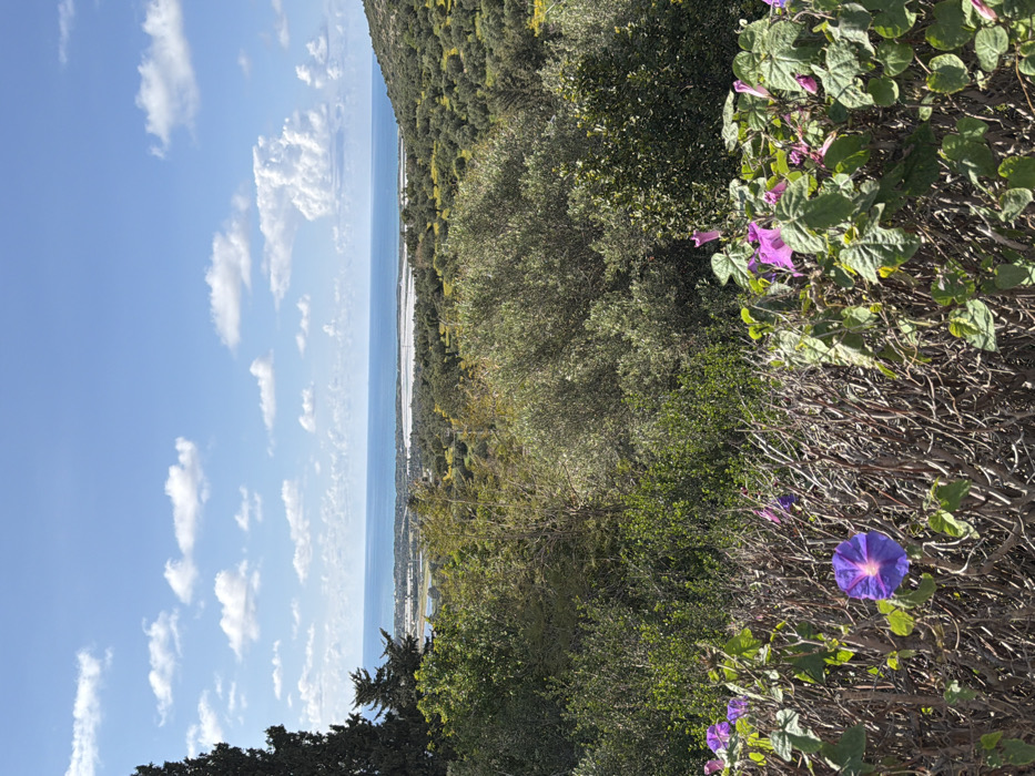 The image displays a panoramic landscape observed from an elevated perspective, situated within the Hof HaCarmel Regional Council, Israel, under a bright daytime sky with scattered white cumulus clouds. In the distant background, the blue Mediterranean Sea spans the horizon. Below the sea, a coastal plain or valley is visible, featuring a prominent, lighter-colored body of water or what appears to be salt flats, bordered by green vegetation and indistinct low-lying features. The midground is characterized by rolling hills extensively covered with dense green vegetation, including numerous evenly spaced olive trees and scattered patches of yellow flora. A tall, dark green coniferous tree is positioned on the far left, with additional smaller coniferous trees nearby. The immediate foreground is occupied by a dense, mostly bare, woody shrub or hedge with intertwining brown branches. Climbing over this shrubbery are flowering plants with green leaves and trumpet-shaped blossoms; a single vibrant purple flower with a lighter central star pattern is prominent on the left, while several pinkish-purple flowers and buds are visible towards the right. No individuals or specific actions are depicted.