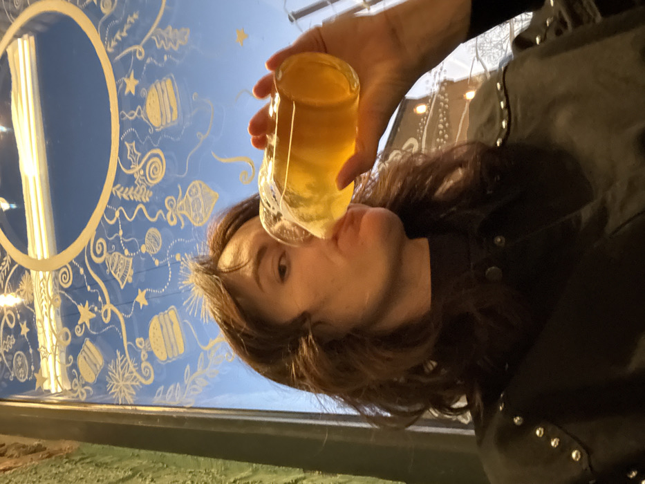 A female subject, with dark brown, wavy, shoulder-length hair, is depicted in a three-quarter profile, actively drinking from a clear glass vessel containing an amber-colored liquid. She wears a black high-necked garment under a dark jacket adorned with silver-colored studs along the shoulder. Her right hand grips the glass, tilted upwards to her mouth. The background features a large window decorated with white painted designs including Christmas ornaments, bells, stars, and hamburgers, set against a blue-toned exterior. A prominent circular decoration is visible in the upper right quadrant of the window. A textured, possibly green, wall section is visible on the far left. The scene is located in Palilula Urban Municipality, Serbia.
