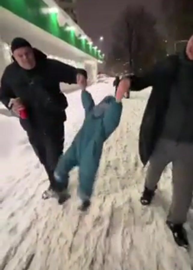 three people walking on a snowy path. Two adults are holding the hands of a child who is wearing a blue snowsuit. The adults are wearing winter clothes. The path is covered in snow and there are buildings in the background. It appears to be nighttime. At the start of the video, the child is briefly lifted into the air by one adult while the other supports them, before they all continue walking together.