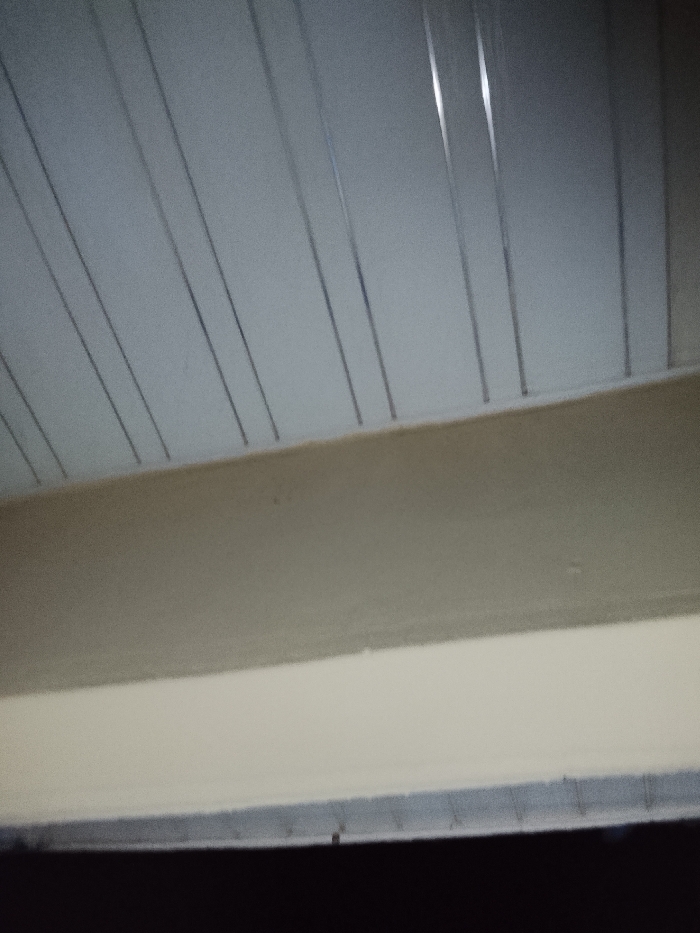 The image depicts an interior space with a distinct ceiling and wall configuration. The ceiling appears to be constructed from a series of parallel, rectangular panels with narrow dividing lines. Below the ceiling is a wall painted in two shades of beige. A darker beige section transitions to a lighter beige tone near the bottom. The bottom edge of the wall is lined with a thin, dark-colored trim, fading into darkness at the bottom of the image.